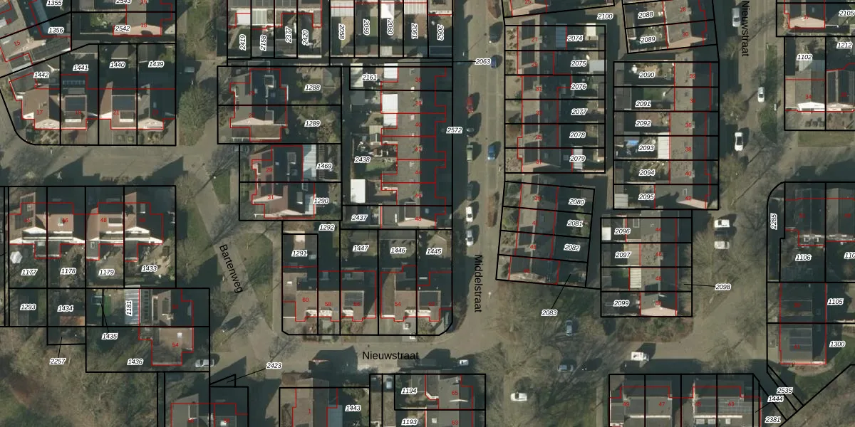 Het perceel waarop Middelstraat 48 staat heeft een oppervlakte van 145 m². Dit is een middelgroot perceel. De perceeloppervlakte wordt geregistreerd door het Kadaster. Gedetailleerde informatie over de maten van dit perceel kunt u vinden in het rapport Kadastrale kaart met maatvoering van Middelstraat 48.