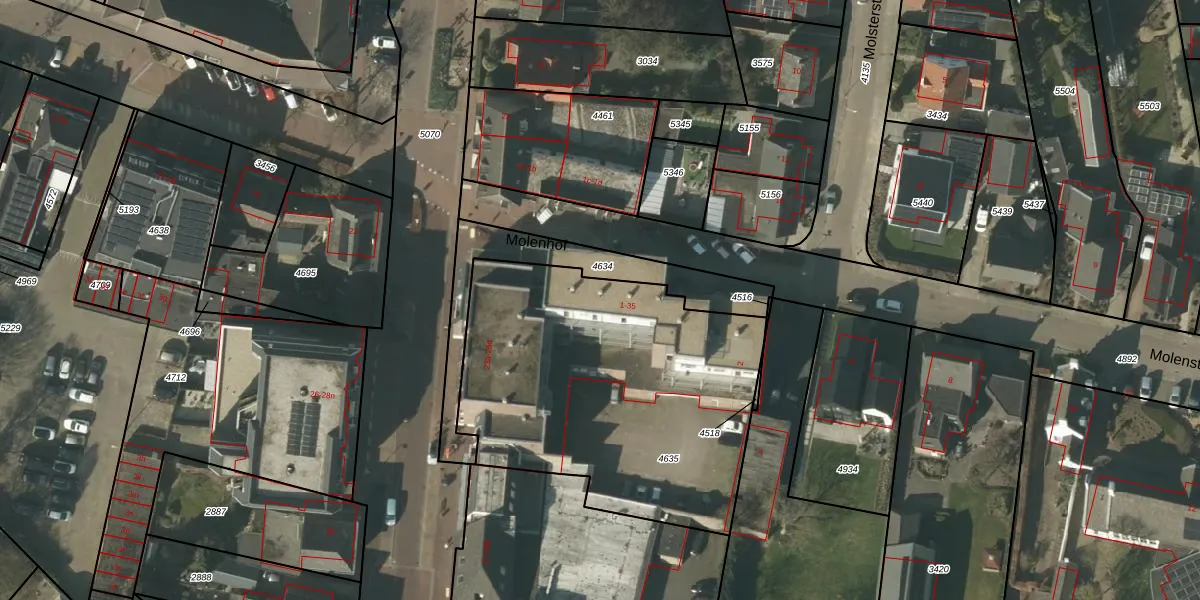 Het perceel waarop Molenhof 4 staat heeft een oppervlakte van 1728 m². Dit is een zeer groot perceel. De perceeloppervlakte wordt geregistreerd door het Kadaster. Gedetailleerde informatie over de maten van dit perceel kunt u vinden in het rapport Kadastrale kaart met maatvoering van Molenhof 4.