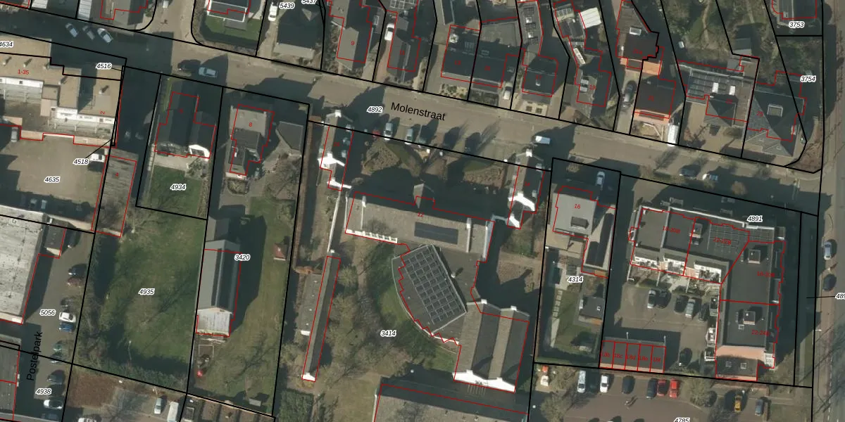 Het perceel waarop Molenstraat 12 staat heeft een oppervlakte van 4709 m². Dit is een zeer groot perceel. De perceeloppervlakte wordt geregistreerd door het Kadaster. Gedetailleerde informatie over de maten van dit perceel kunt u vinden in het rapport Kadastrale kaart met maatvoering van Molenstraat 12.