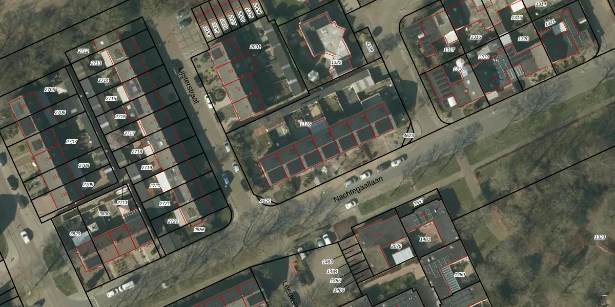 Het perceel waarop Nachtegaallaan 13 staat heeft een oppervlakte van 1582 m². Dit is een zeer groot perceel. De perceeloppervlakte wordt geregistreerd door het Kadaster. Gedetailleerde informatie over de maten van dit perceel kunt u vinden in het rapport Kadastrale kaart met maatvoering van Nachtegaallaan 13.