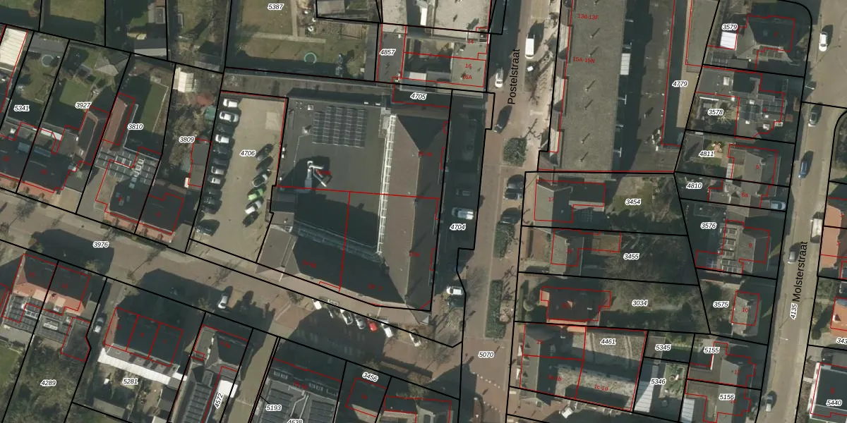 Het perceel waarop Postelstraat 20 staat heeft een oppervlakte van 2085 m². Dit is een zeer groot perceel. De perceeloppervlakte wordt geregistreerd door het Kadaster. Gedetailleerde informatie over de maten van dit perceel kunt u vinden in het rapport Kadastrale kaart met maatvoering van Postelstraat 20.
