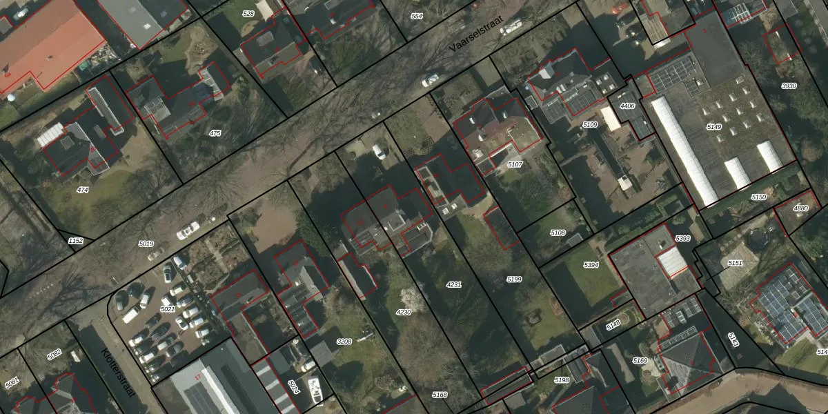 Het perceel waarop Vaarselstraat 9 staat heeft een oppervlakte van 955 m². Dit is een groot perceel. De perceeloppervlakte wordt geregistreerd door het Kadaster. Gedetailleerde informatie over de maten van dit perceel kunt u vinden in het rapport Kadastrale kaart met maatvoering van Vaarselstraat 9.