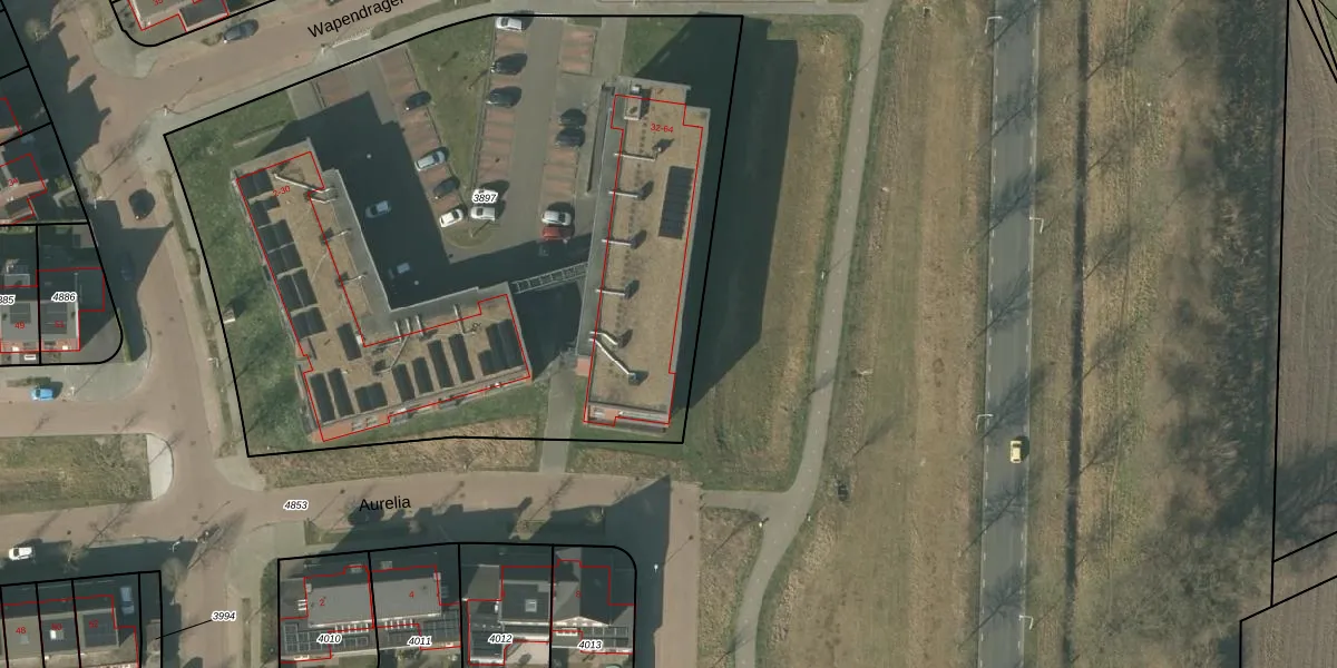 Het perceel waarop Wapendrager 36 staat heeft een oppervlakte van 4512 m². Dit is een zeer groot perceel. De perceeloppervlakte wordt geregistreerd door het Kadaster. Gedetailleerde informatie over de maten van dit perceel kunt u vinden in het rapport Kadastrale kaart met maatvoering van Wapendrager 36.