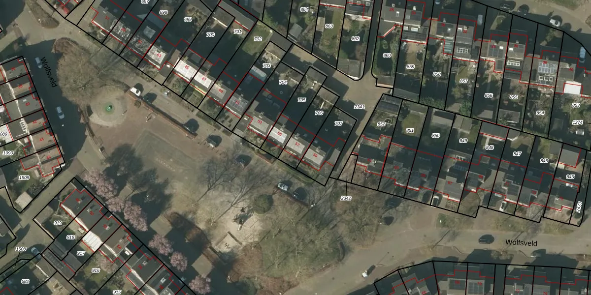 Het perceel waarop Wolfsveld 57 staat heeft een oppervlakte van 202 m². Dit is een middelgroot perceel. De perceeloppervlakte wordt geregistreerd door het Kadaster. Gedetailleerde informatie over de maten van dit perceel kunt u vinden in het rapport Kadastrale kaart met maatvoering van Wolfsveld 57.
