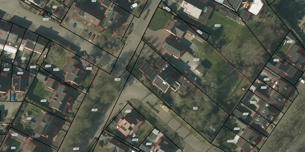 Het perceel waarop Wolfsveld 83 staat heeft een oppervlakte van 1535 m². Dit is een zeer groot perceel. De perceeloppervlakte wordt geregistreerd door het Kadaster. Gedetailleerde informatie over de maten van dit perceel kunt u vinden in het rapport Kadastrale kaart met maatvoering van Wolfsveld 83.