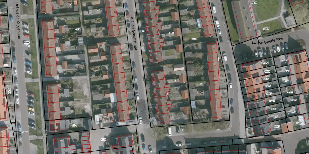 Het perceel waarop A.J. de Graaffstraat 22 staat heeft een oppervlakte van 3085 m². Dit is een zeer groot perceel. De perceeloppervlakte wordt geregistreerd door het Kadaster. Gedetailleerde informatie over de maten van dit perceel kunt u vinden in het rapport Kadastrale kaart met maatvoering van A.J. de Graaffstraat 22.