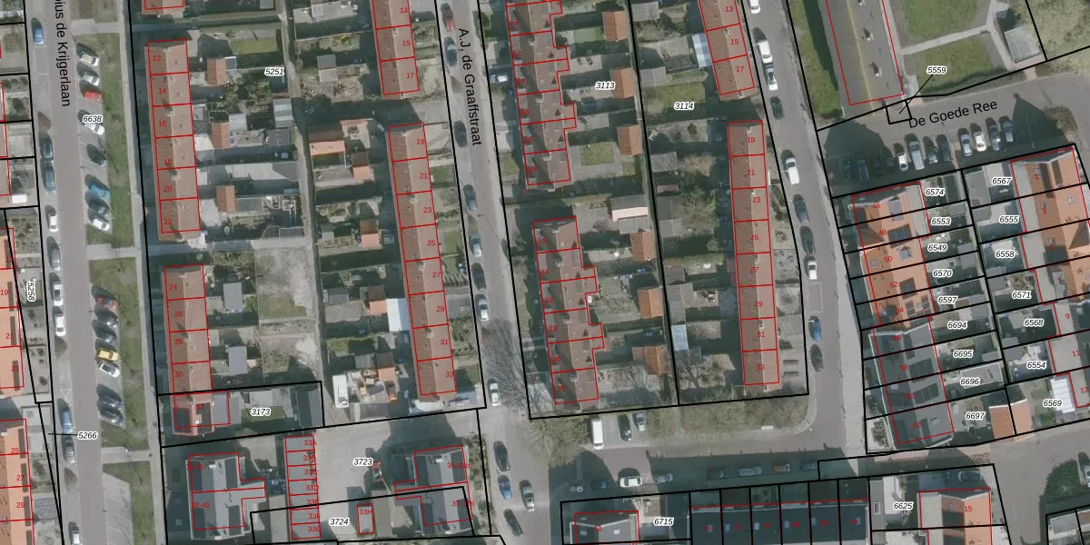 Het perceel waarop A.J. de Graaffstraat 24 staat heeft een oppervlakte van 3085 m². Dit is een zeer groot perceel. De perceeloppervlakte wordt geregistreerd door het Kadaster. Gedetailleerde informatie over de maten van dit perceel kunt u vinden in het rapport Kadastrale kaart met maatvoering van A.J. de Graaffstraat 24.