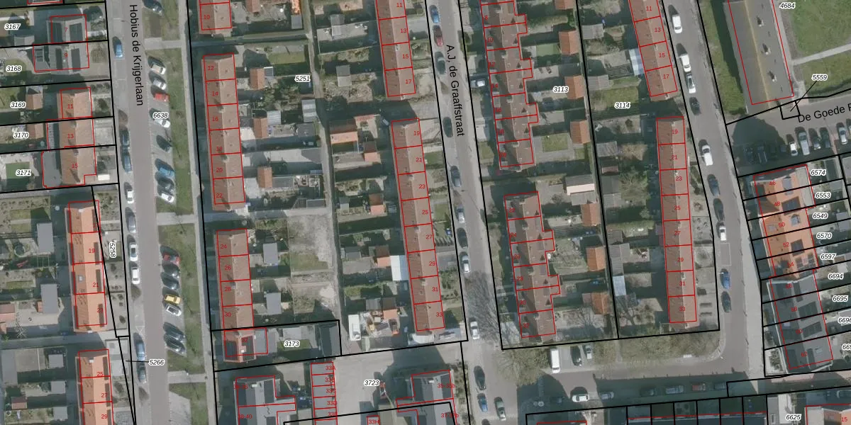 Het perceel waarop A.J. de Graaffstraat 25 staat heeft een oppervlakte van 5588 m². Dit is een zeer groot perceel. De perceeloppervlakte wordt geregistreerd door het Kadaster. Gedetailleerde informatie over de maten van dit perceel kunt u vinden in het rapport Kadastrale kaart met maatvoering van A.J. de Graaffstraat 25.