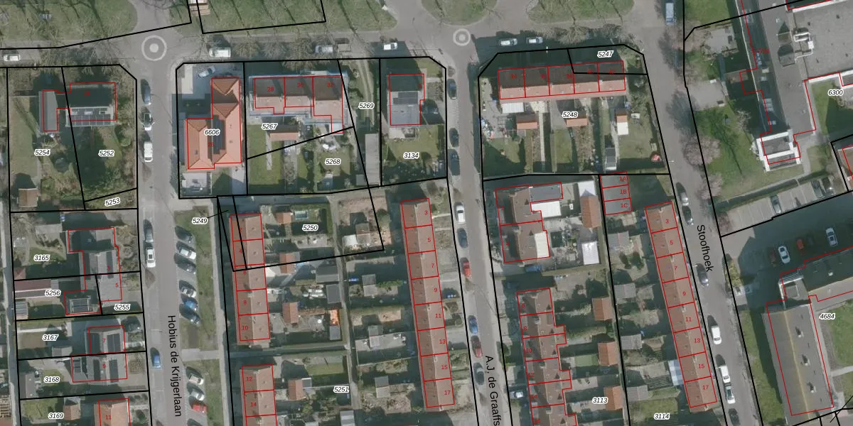Het perceel waarop A.J. de Graaffstraat 3 staat heeft een oppervlakte van 5588 m². Dit is een zeer groot perceel. De perceeloppervlakte wordt geregistreerd door het Kadaster. Gedetailleerde informatie over de maten van dit perceel kunt u vinden in het rapport Kadastrale kaart met maatvoering van A.J. de Graaffstraat 3.