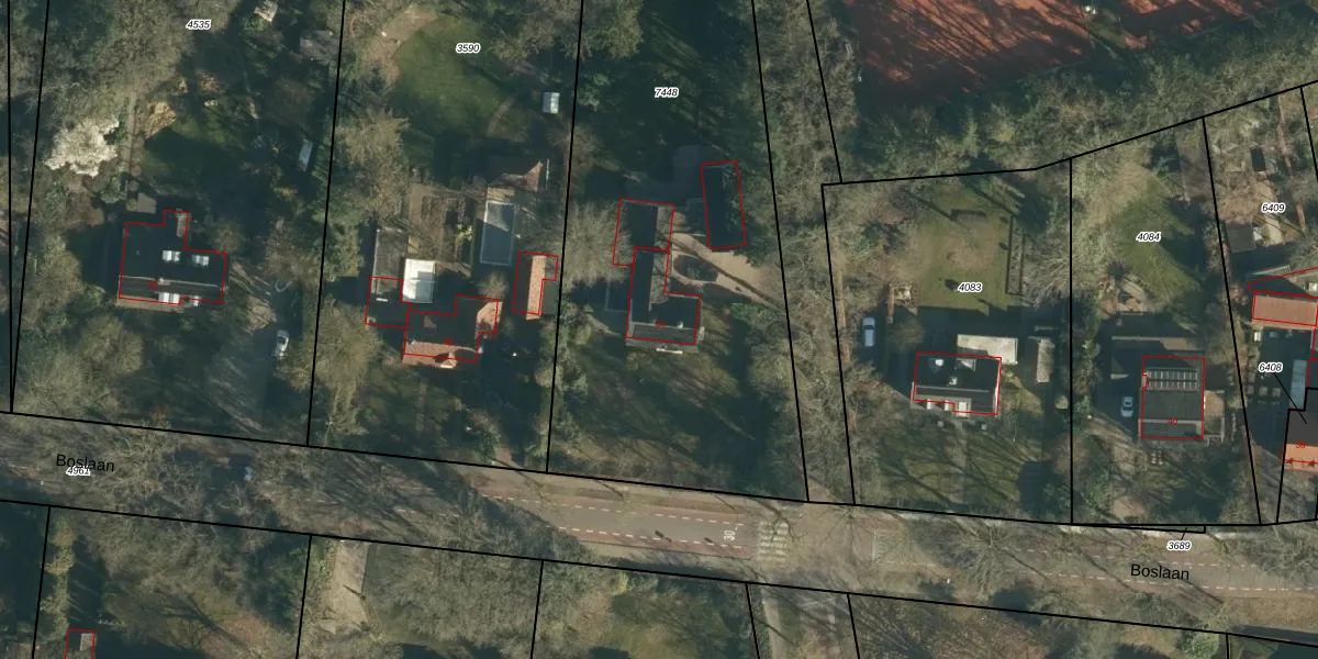 Het perceel waarop Boslaan 44 staat heeft een oppervlakte van 2533 m². Dit is een zeer groot perceel. De perceeloppervlakte wordt geregistreerd door het Kadaster. Gedetailleerde informatie over de maten van dit perceel kunt u vinden in het rapport Kadastrale kaart met maatvoering van Boslaan 44.