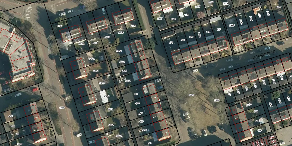 Het perceel waarop Trompstraat 13 staat heeft een oppervlakte van 265 m². Dit is een middelgroot perceel. De perceeloppervlakte wordt geregistreerd door het Kadaster. Gedetailleerde informatie over de maten van dit perceel kunt u vinden in het rapport Kadastrale kaart met maatvoering van Trompstraat 13.