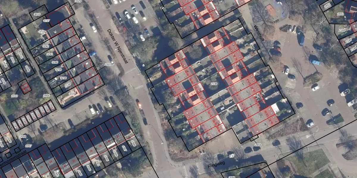 Het perceel waarop Westhoff 68 staat heeft een oppervlakte van 3600 m². Dit is een zeer groot perceel. De perceeloppervlakte wordt geregistreerd door het Kadaster. Gedetailleerde informatie over de maten van dit perceel kunt u vinden in het rapport Kadastrale kaart met maatvoering van Westhoff 68.