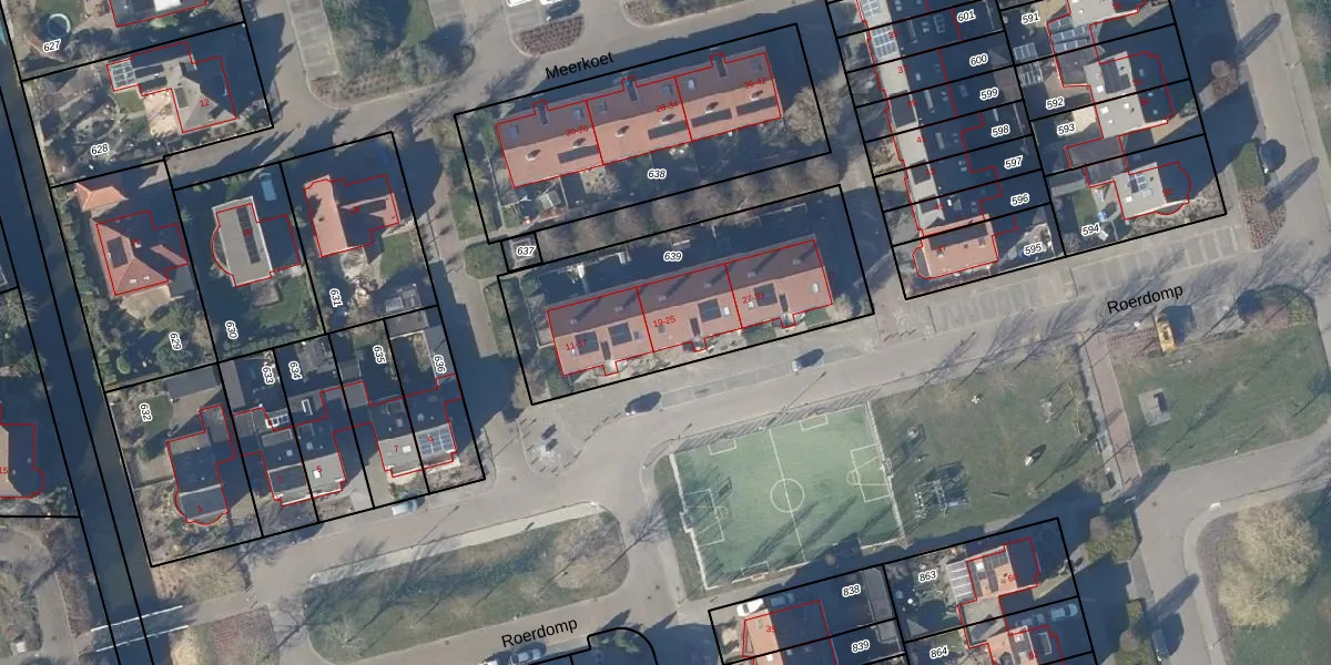 Het perceel waarop Roerdomp 19 staat heeft een oppervlakte van 1065 m². Dit is een zeer groot perceel. De perceeloppervlakte wordt geregistreerd door het Kadaster. Gedetailleerde informatie over de maten van dit perceel kunt u vinden in het rapport Kadastrale kaart met maatvoering van Roerdomp 19.
