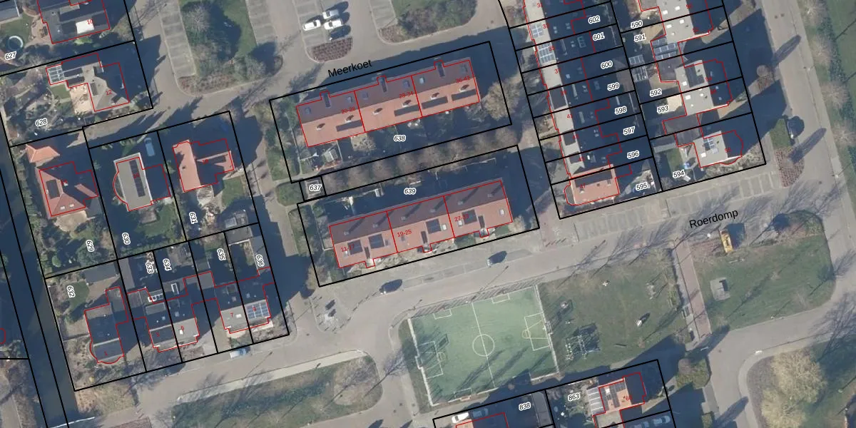 Roerdomp 23 is gelegen op kadastraal perceel OMR01X639. Deze kadastrale aanduiding is uniek en wordt gebruikt door het Kadaster om eigendomsrechten en andere zakelijke rechten vast te leggen. Het perceel maakt onderdeel uit van de kadastrale gemeente Opmeer.