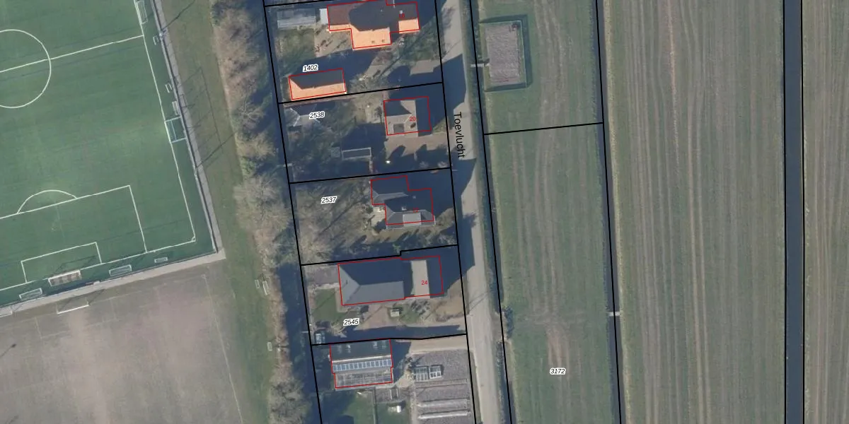 Het perceel waarop Toevlucht 22 staat heeft een oppervlakte van 725 m². Dit is een groot perceel. De perceeloppervlakte wordt geregistreerd door het Kadaster. Gedetailleerde informatie over de maten van dit perceel kunt u vinden in het rapport Kadastrale kaart met maatvoering van Toevlucht 22.