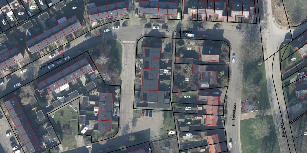 Het perceel waarop Van Rhemenhof 9 staat heeft een oppervlakte van 1210 m². Dit is een zeer groot perceel. De perceeloppervlakte wordt geregistreerd door het Kadaster. Gedetailleerde informatie over de maten van dit perceel kunt u vinden in het rapport Kadastrale kaart met maatvoering van Van Rhemenhof 9.