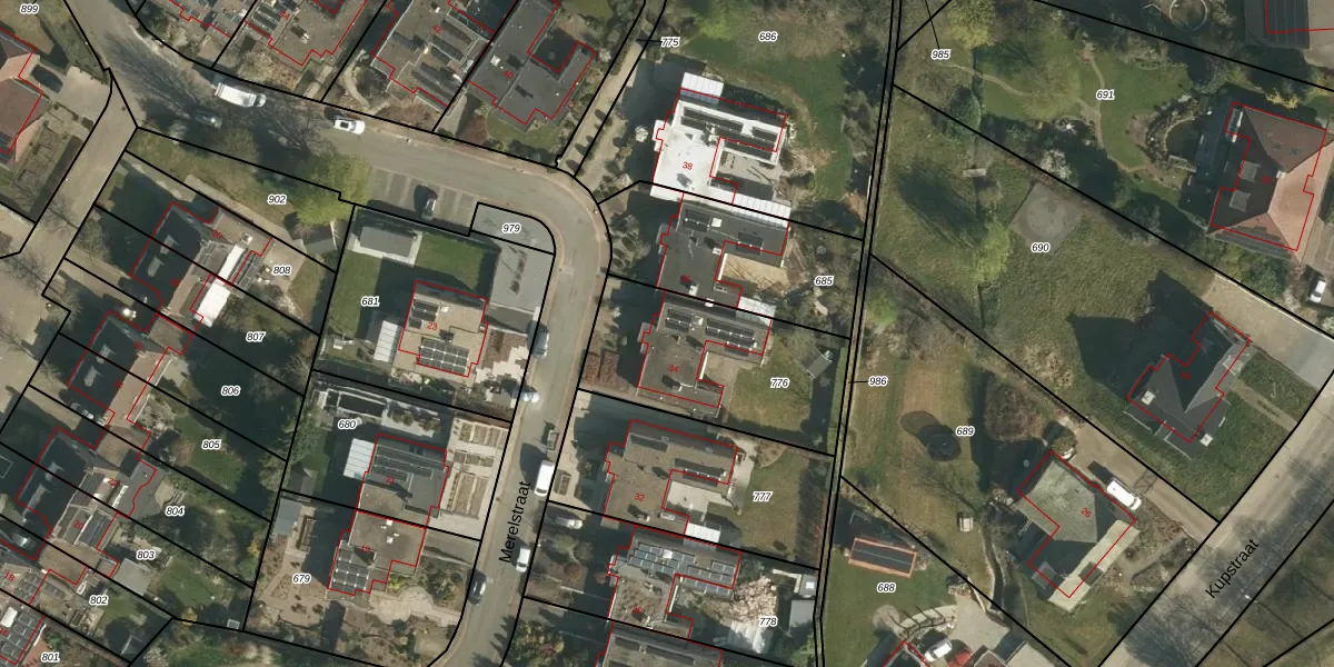 Het perceel waarop Merelstraat 34 staat heeft een oppervlakte van 685 m². Dit is een groot perceel. De perceeloppervlakte wordt geregistreerd door het Kadaster. Gedetailleerde informatie over de maten van dit perceel kunt u vinden in het rapport Kadastrale kaart met maatvoering van Merelstraat 34.