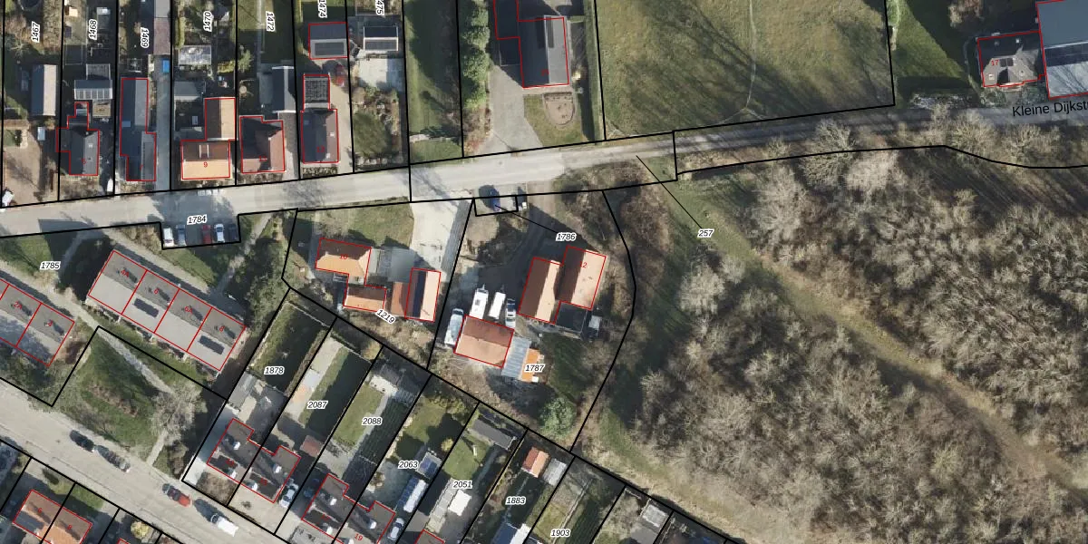 Het perceel waarop Kleine Dijkstraat 12 staat heeft een oppervlakte van 1185 m². Dit is een zeer groot perceel. De perceeloppervlakte wordt geregistreerd door het Kadaster. Gedetailleerde informatie over de maten van dit perceel kunt u vinden in het rapport Kadastrale kaart met maatvoering van Kleine Dijkstraat 12.