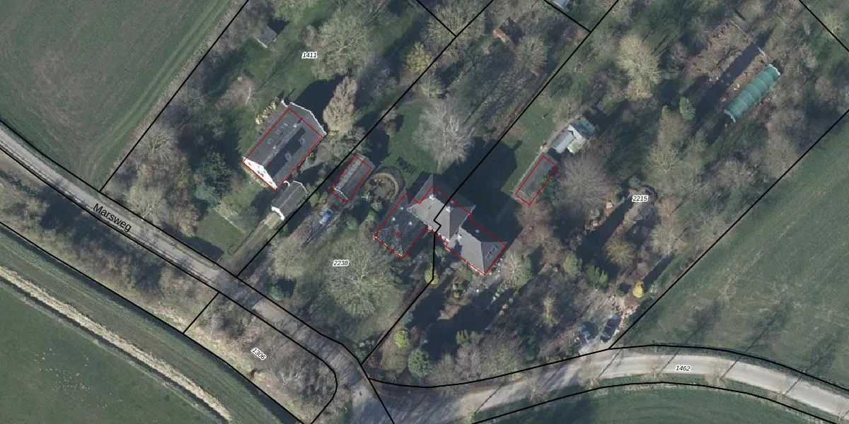 Het perceel waarop Marsweg 1-a staat heeft een oppervlakte van 2645 m². Dit is een zeer groot perceel. De perceeloppervlakte wordt geregistreerd door het Kadaster. Gedetailleerde informatie over de maten van dit perceel kunt u vinden in het rapport Kadastrale kaart met maatvoering van Marsweg 1-a.