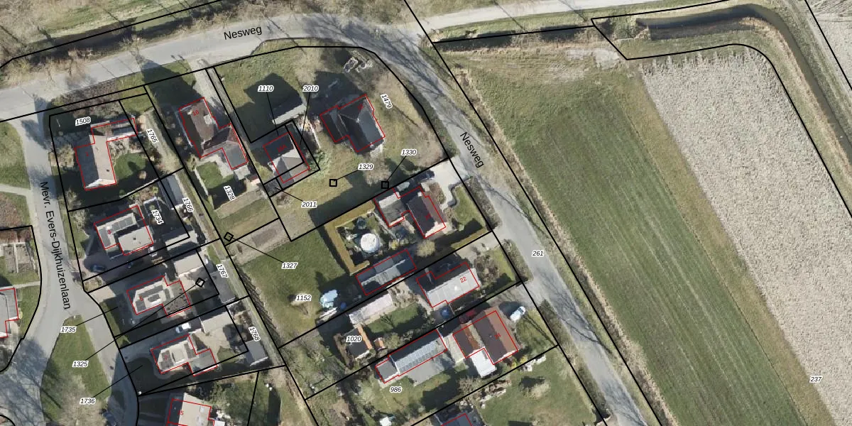 Het perceel waarop Nesweg 20 staat heeft een oppervlakte van 1240 m². Dit is een zeer groot perceel. De perceeloppervlakte wordt geregistreerd door het Kadaster. Gedetailleerde informatie over de maten van dit perceel kunt u vinden in het rapport Kadastrale kaart met maatvoering van Nesweg 20.
