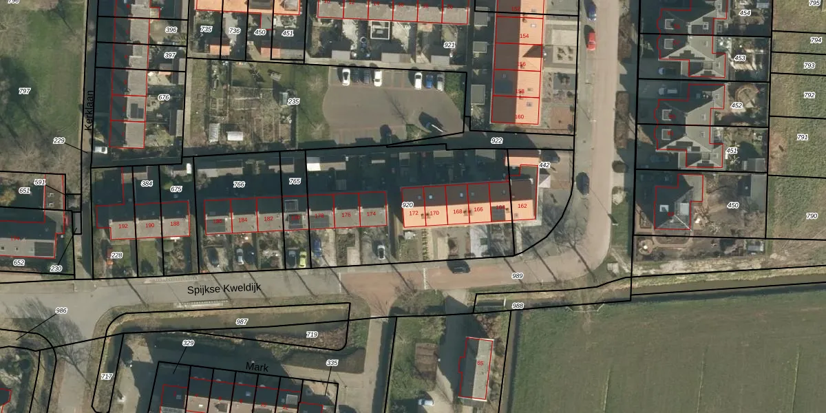 Het perceel waarop Spijkse Kweldijk 172 staat heeft een oppervlakte van 1363 m². Dit is een zeer groot perceel. De perceeloppervlakte wordt geregistreerd door het Kadaster. Gedetailleerde informatie over de maten van dit perceel kunt u vinden in het rapport Kadastrale kaart met maatvoering van Spijkse Kweldijk 172.