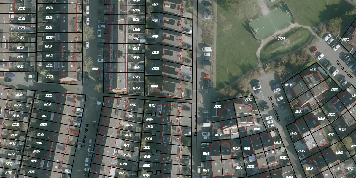 Het perceel waarop Tigrisstraat 21 staat heeft een oppervlakte van 300 m². Dit is een groot perceel. De perceeloppervlakte wordt geregistreerd door het Kadaster. Gedetailleerde informatie over de maten van dit perceel kunt u vinden in het rapport Kadastrale kaart met maatvoering van Tigrisstraat 21.