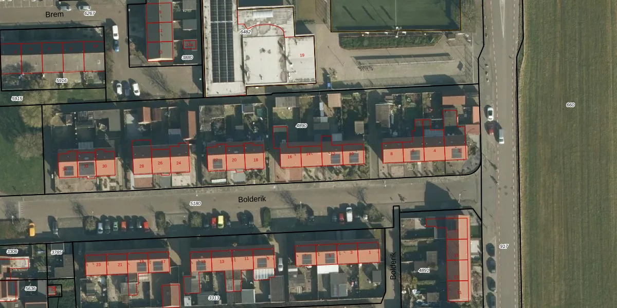 Het perceel waarop Bolderik 14 staat heeft een oppervlakte van 4113 m². Dit is een zeer groot perceel. De perceeloppervlakte wordt geregistreerd door het Kadaster. Gedetailleerde informatie over de maten van dit perceel kunt u vinden in het rapport Kadastrale kaart met maatvoering van Bolderik 14.