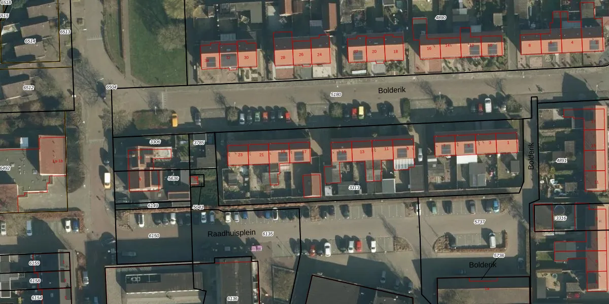 Het perceel waarop Bolderik 17 staat heeft een oppervlakte van 2415 m². Dit is een zeer groot perceel. De perceeloppervlakte wordt geregistreerd door het Kadaster. Gedetailleerde informatie over de maten van dit perceel kunt u vinden in het rapport Kadastrale kaart met maatvoering van Bolderik 17.