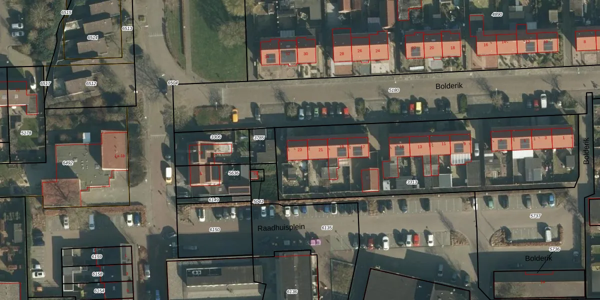 Het perceel waarop Bolderik 23 staat heeft een oppervlakte van 2415 m². Dit is een zeer groot perceel. De perceeloppervlakte wordt geregistreerd door het Kadaster. Gedetailleerde informatie over de maten van dit perceel kunt u vinden in het rapport Kadastrale kaart met maatvoering van Bolderik 23.