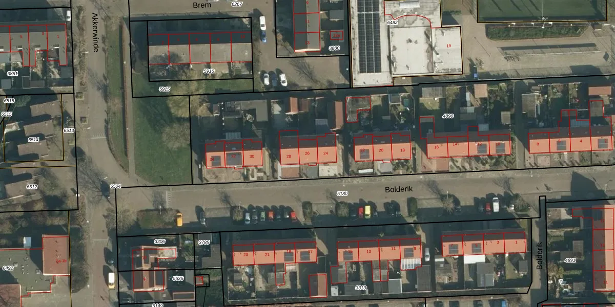 Het perceel waarop Bolderik 26 staat heeft een oppervlakte van 4113 m². Dit is een zeer groot perceel. De perceeloppervlakte wordt geregistreerd door het Kadaster. Gedetailleerde informatie over de maten van dit perceel kunt u vinden in het rapport Kadastrale kaart met maatvoering van Bolderik 26.