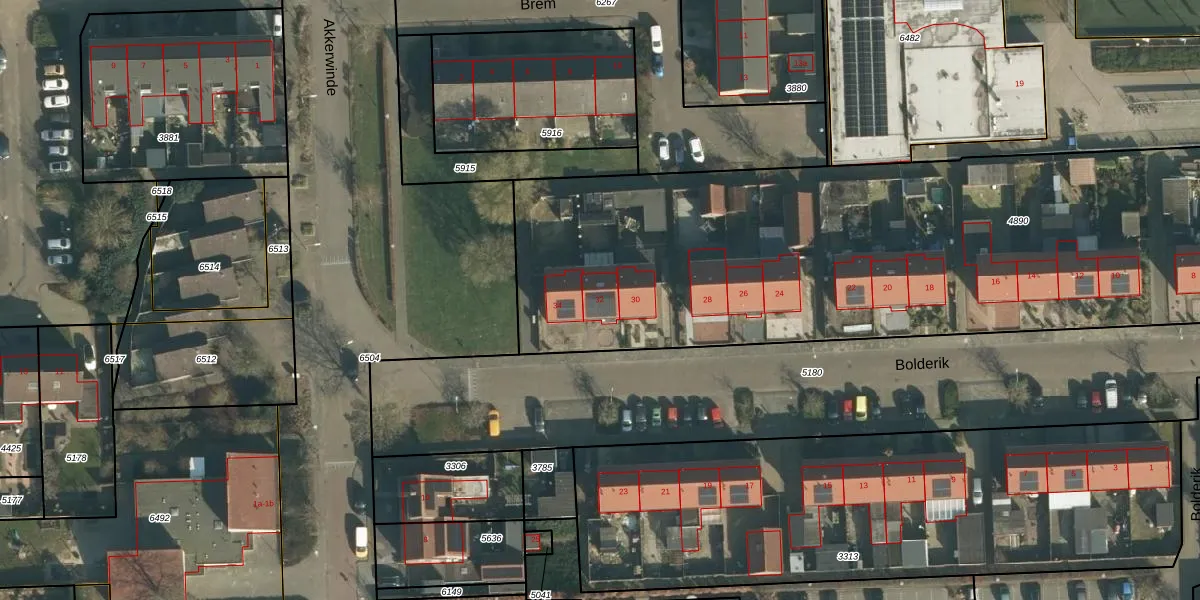 Het perceel waarop Bolderik 32 staat heeft een oppervlakte van 4113 m². Dit is een zeer groot perceel. De perceeloppervlakte wordt geregistreerd door het Kadaster. Gedetailleerde informatie over de maten van dit perceel kunt u vinden in het rapport Kadastrale kaart met maatvoering van Bolderik 32.