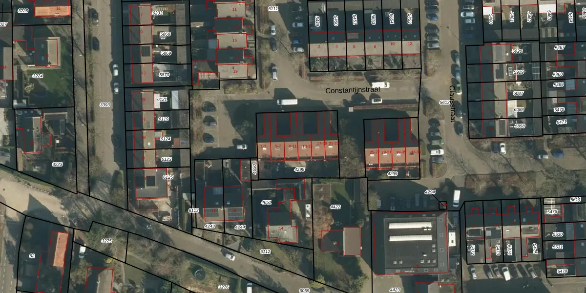 Het perceel waarop Constantijnstraat 9 staat heeft een oppervlakte van 636 m². Dit is een groot perceel. De perceeloppervlakte wordt geregistreerd door het Kadaster. Gedetailleerde informatie over de maten van dit perceel kunt u vinden in het rapport Kadastrale kaart met maatvoering van Constantijnstraat 9.