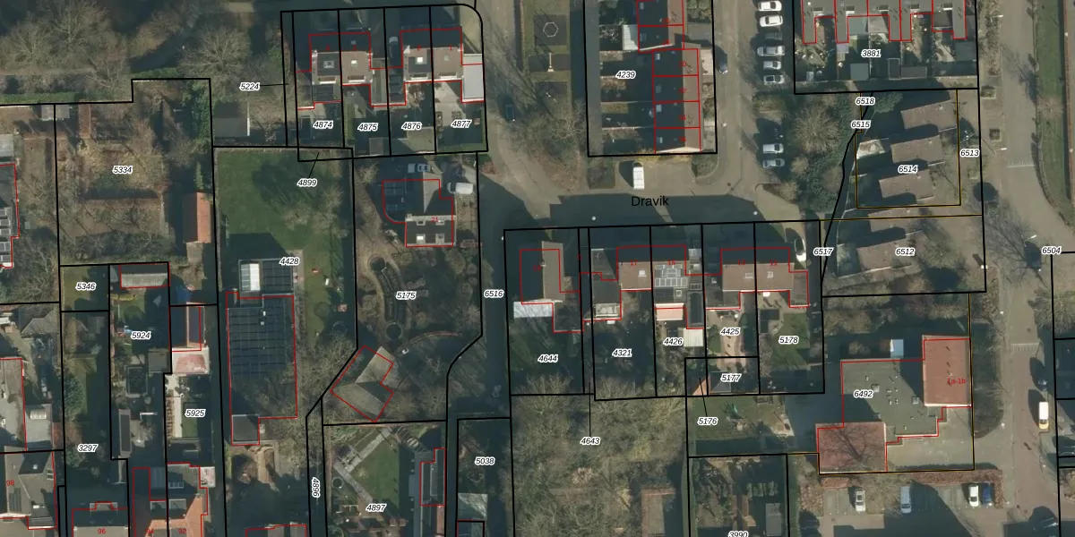 Het perceel waarop Dravik 19 staat heeft een oppervlakte van 426 m². Dit is een groot perceel. De perceeloppervlakte wordt geregistreerd door het Kadaster. Gedetailleerde informatie over de maten van dit perceel kunt u vinden in het rapport Kadastrale kaart met maatvoering van Dravik 19.