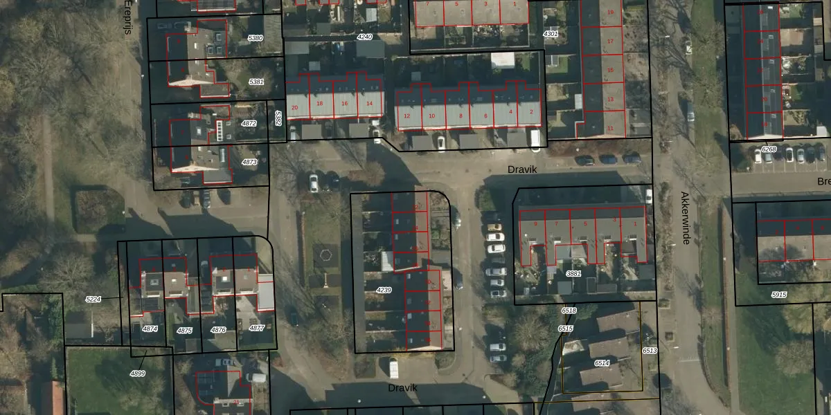Het perceel waarop Dravik 22 staat heeft een oppervlakte van 917 m². Dit is een groot perceel. De perceeloppervlakte wordt geregistreerd door het Kadaster. Gedetailleerde informatie over de maten van dit perceel kunt u vinden in het rapport Kadastrale kaart met maatvoering van Dravik 22.