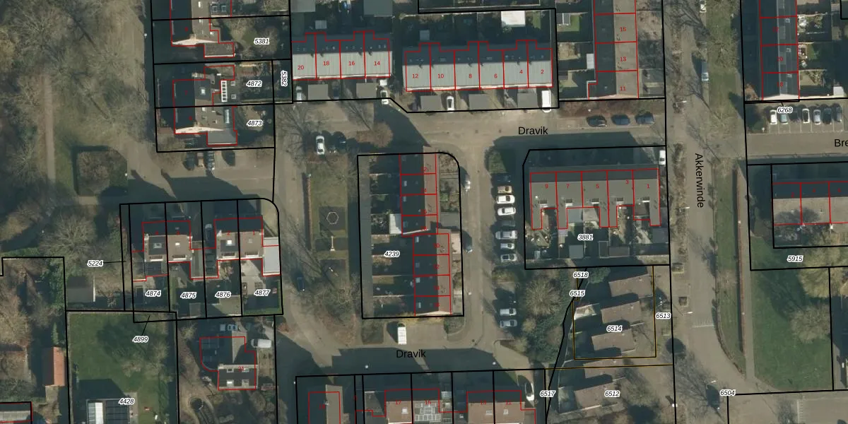 Het perceel waarop Dravik 26 staat heeft een oppervlakte van 917 m². Dit is een groot perceel. De perceeloppervlakte wordt geregistreerd door het Kadaster. Gedetailleerde informatie over de maten van dit perceel kunt u vinden in het rapport Kadastrale kaart met maatvoering van Dravik 26.