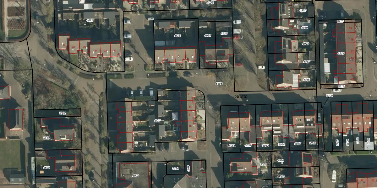 Het perceel waarop Grutto 9 staat heeft een oppervlakte van 1400 m². Dit is een zeer groot perceel. De perceeloppervlakte wordt geregistreerd door het Kadaster. Gedetailleerde informatie over de maten van dit perceel kunt u vinden in het rapport Kadastrale kaart met maatvoering van Grutto 9.