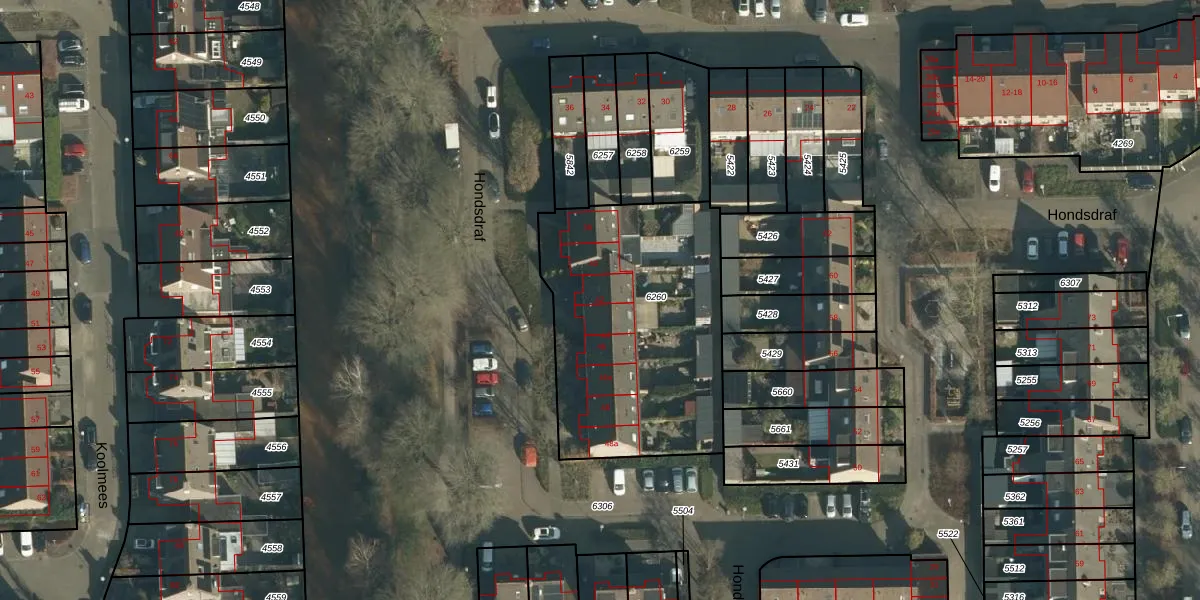 Hondsdraf 42 is gelegen op kadastraal perceel SPR01B6260. Deze kadastrale aanduiding is uniek en wordt gebruikt door het Kadaster om eigendomsrechten en andere zakelijke rechten vast te leggen. Het perceel maakt onderdeel uit van de kadastrale gemeente Sprang.
