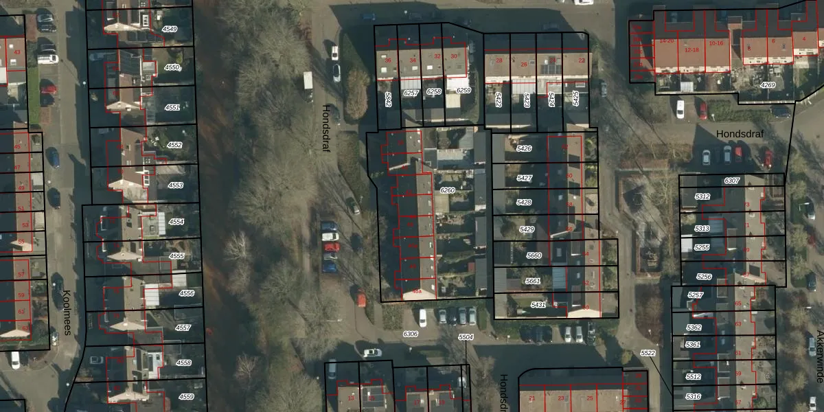 Hondsdraf 44 is gelegen op kadastraal perceel SPR01B6260. Deze kadastrale aanduiding is uniek en wordt gebruikt door het Kadaster om eigendomsrechten en andere zakelijke rechten vast te leggen. Het perceel maakt onderdeel uit van de kadastrale gemeente Sprang.