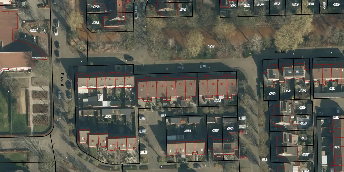Houtduif 20 is gelegen op kadastraal perceel SPR01B4625. Deze kadastrale aanduiding is uniek en wordt gebruikt door het Kadaster om eigendomsrechten en andere zakelijke rechten vast te leggen. Het perceel maakt onderdeel uit van de kadastrale gemeente Sprang.