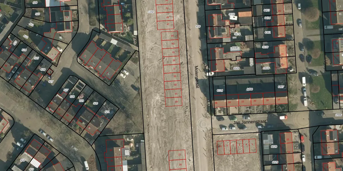 Molenstraat 33 is gelegen op kadastraal perceel SPR01C1192. Deze kadastrale aanduiding is uniek en wordt gebruikt door het Kadaster om eigendomsrechten en andere zakelijke rechten vast te leggen. Het perceel maakt onderdeel uit van de kadastrale gemeente Sprang.