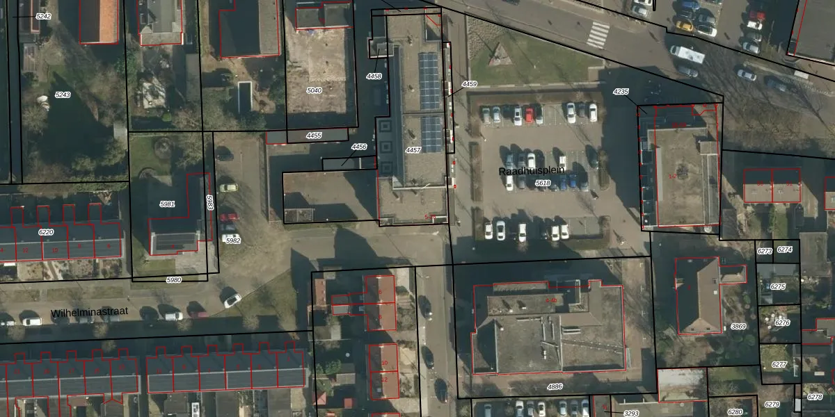 Het perceel waarop Raadhuisplein 5 staat heeft een oppervlakte van 1038 m². Dit is een zeer groot perceel. De perceeloppervlakte wordt geregistreerd door het Kadaster. Gedetailleerde informatie over de maten van dit perceel kunt u vinden in het rapport Kadastrale kaart met maatvoering van Raadhuisplein 5.