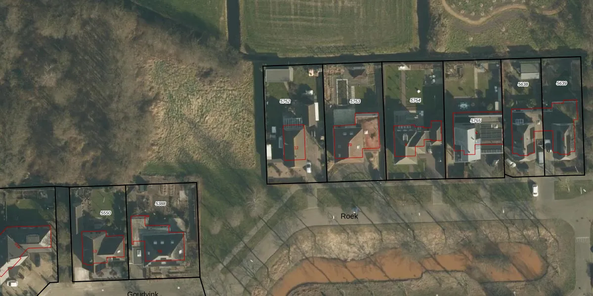 Het perceel waarop Roek 12 staat heeft een oppervlakte van 805 m². Dit is een groot perceel. De perceeloppervlakte wordt geregistreerd door het Kadaster. Gedetailleerde informatie over de maten van dit perceel kunt u vinden in het rapport Kadastrale kaart met maatvoering van Roek 12.