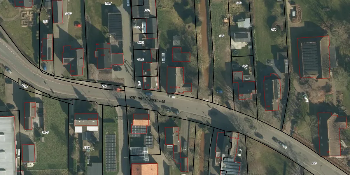 Het perceel waarop van der Duinstraat 112 staat heeft een oppervlakte van 2026 m². Dit is een zeer groot perceel. De perceeloppervlakte wordt geregistreerd door het Kadaster. Gedetailleerde informatie over de maten van dit perceel kunt u vinden in het rapport Kadastrale kaart met maatvoering van van der Duinstraat 112.