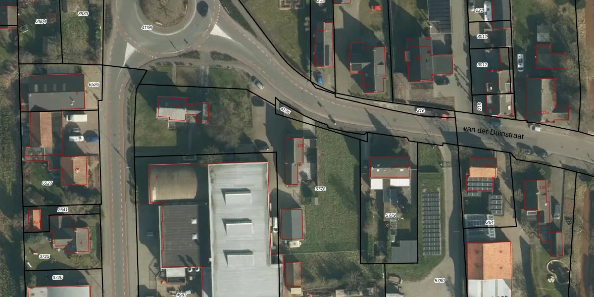 Het perceel waarop van der Duinstraat 139 staat heeft een oppervlakte van 3799 m². Dit is een zeer groot perceel. De perceeloppervlakte wordt geregistreerd door het Kadaster. Gedetailleerde informatie over de maten van dit perceel kunt u vinden in het rapport Kadastrale kaart met maatvoering van van der Duinstraat 139.