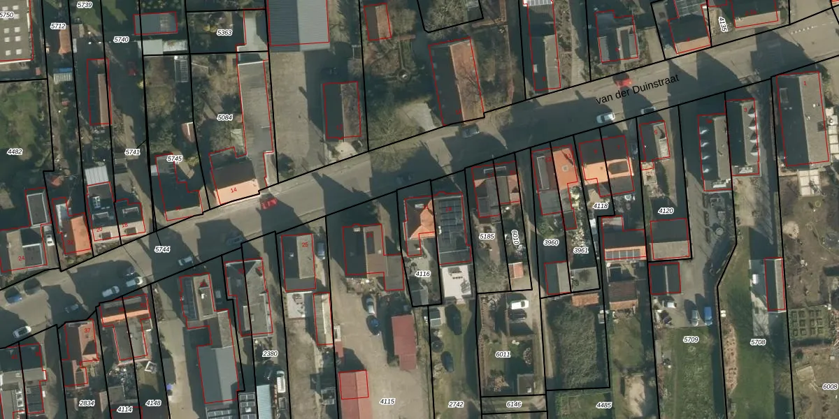 van der Duinstraat 21 is gelegen op kadastraal perceel SPR01B4116. Deze kadastrale aanduiding is uniek en wordt gebruikt door het Kadaster om eigendomsrechten en andere zakelijke rechten vast te leggen. Het perceel maakt onderdeel uit van de kadastrale gemeente Sprang.