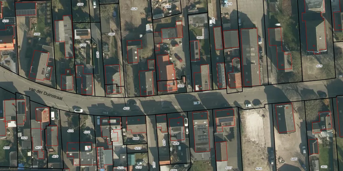 Het perceel waarop van der Duinstraat 56 staat heeft een oppervlakte van 140 m². Dit is een middelgroot perceel. De perceeloppervlakte wordt geregistreerd door het Kadaster. Gedetailleerde informatie over de maten van dit perceel kunt u vinden in het rapport Kadastrale kaart met maatvoering van van der Duinstraat 56.