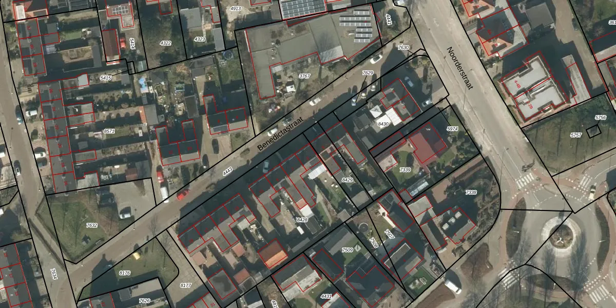 Het perceel waarop Benedictastraat 5 staat heeft een oppervlakte van 1721 m². Dit is een zeer groot perceel. De perceeloppervlakte wordt geregistreerd door het Kadaster. Gedetailleerde informatie over de maten van dit perceel kunt u vinden in het rapport Kadastrale kaart met maatvoering van Benedictastraat 5.