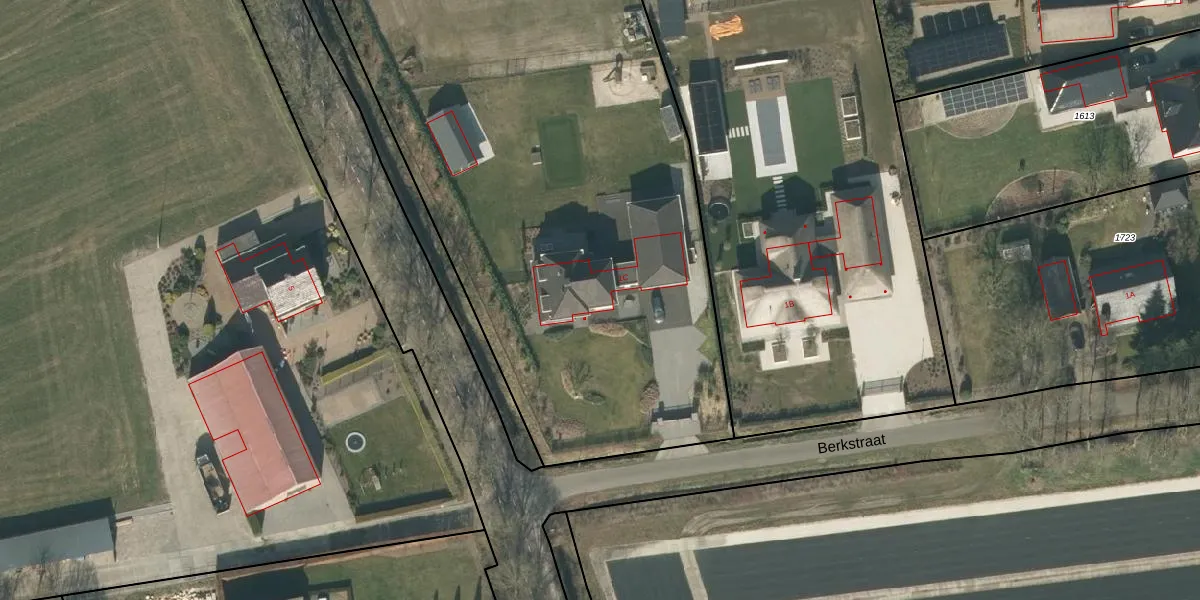 Het perceel waarop Berkstraat 1-C staat heeft een oppervlakte van 7590 m². Dit is een zeer groot perceel. De perceeloppervlakte wordt geregistreerd door het Kadaster. Gedetailleerde informatie over de maten van dit perceel kunt u vinden in het rapport Kadastrale kaart met maatvoering van Berkstraat 1-C.