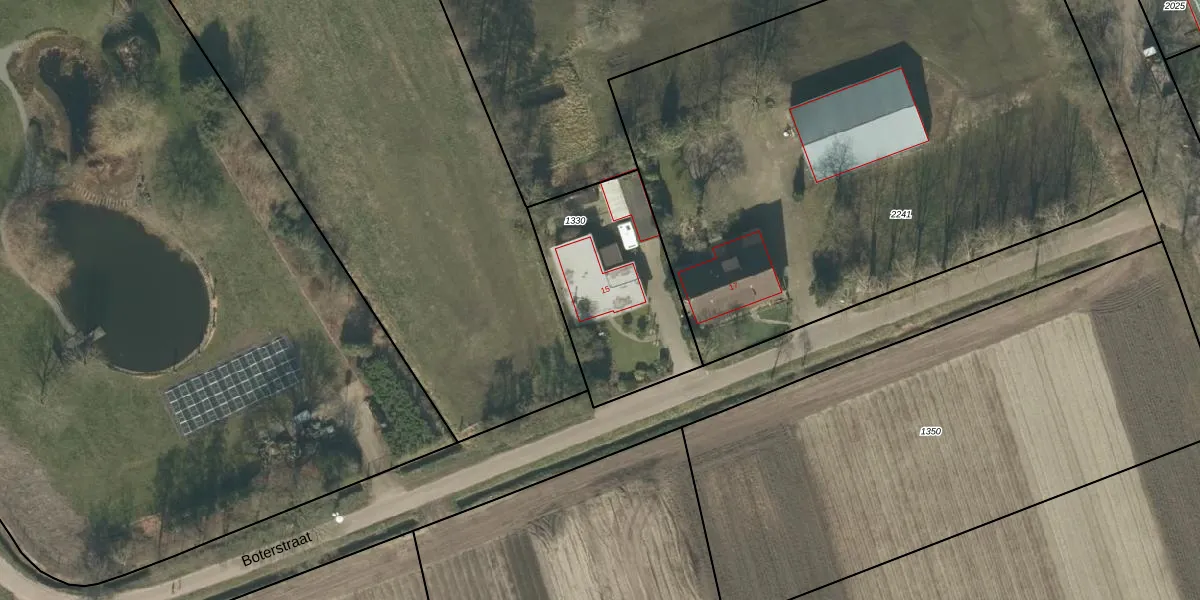 Boterstraat 15 is gelegen op kadastraal perceel RPN00T1330. Deze kadastrale aanduiding is uniek en wordt gebruikt door het Kadaster om eigendomsrechten en andere zakelijke rechten vast te leggen. Het perceel maakt onderdeel uit van de kadastrale gemeente Rucphen.