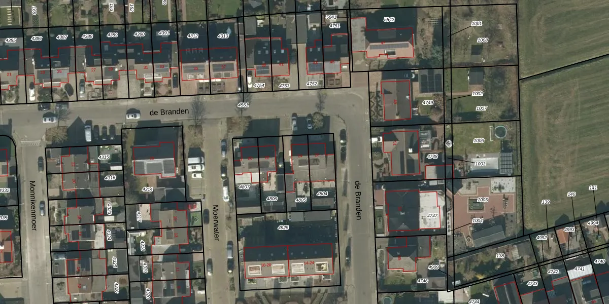 Het perceel waarop de Branden 24 staat heeft een oppervlakte van 206 m². Dit is een middelgroot perceel. De perceeloppervlakte wordt geregistreerd door het Kadaster. Gedetailleerde informatie over de maten van dit perceel kunt u vinden in het rapport Kadastrale kaart met maatvoering van de Branden 24.